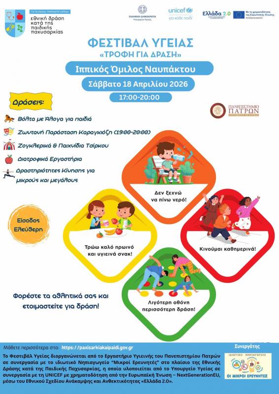 Στο πλαίσιο της Εθνικής Δράσης κατά της Παιδικής Παχυσαρκίας του Υπουργείου Υγείας και της UNICEF, η επιστημονική ομάδα του Πανεπιστημίου Πατρών με Επιστημονικό Υπεύθυνο τον κ. Μιχάλη Λεοτσινίδη, σε συνεργασία με το Ιδιωτικό Νηπιαγωγείο «Μικροί Ερευνητές», σας προσκαλεί σε μια ξεχωριστή γιορτή για μικρούς και μεγάλους, με στόχο την προώθηση της υγιεινής ζωής μέσα από παιχνίδι, δράση, γνώση και διασκέδαση!