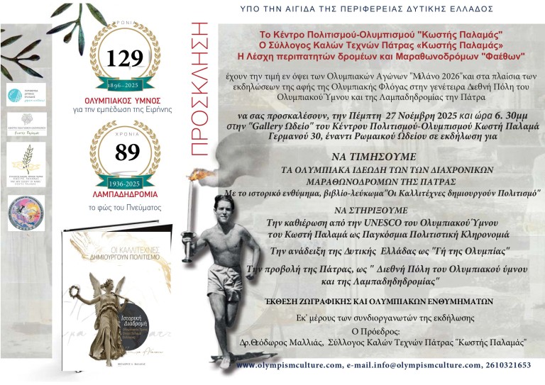 Ο ΣΥΛΛΟΓΟΣ ΚΑΛΩΝ ΤΕΧΝΩΝ ΠΑΤΡΑΣ «ΚΩΣΤΗΣ ΠΑΛΑΜΑΣ» ΤΟ ΚΕΝΤΡΟ ΠΟΛΙΤΙΣΜΟΥ-ΟΛΥΜΠΙΣΜΟΥ ΚΑΙ Η ΛΕΣΧΗ ΠΕΡΙΠΑΤΗΤΩΝ ΔΡΟΜΕΩΝ ΚΑΙ ΜΑΡΑΘΩΝΟΔΡΟΜΩΝ «ΦΑΕΘΩΝ»