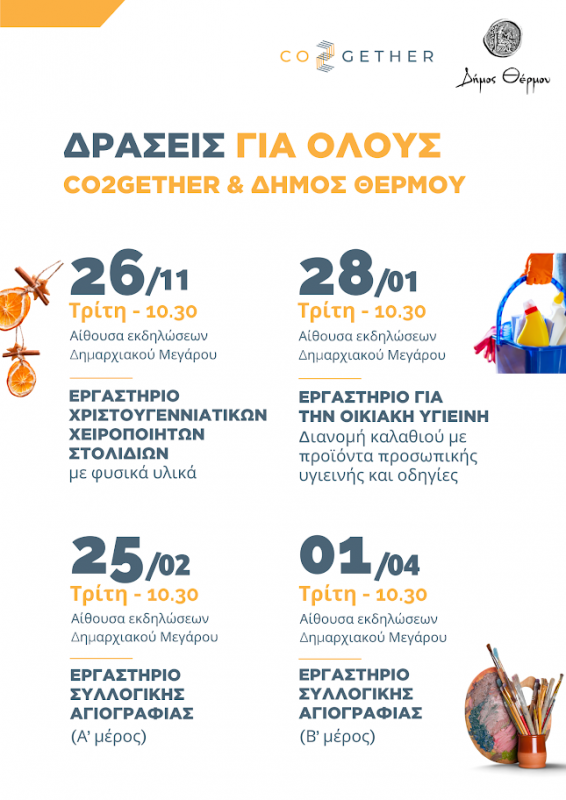 Η ομάδα της Co2gether θα επιστρέψει στον Δήμο Θέρμου και τον επόμενο μήνα, για την καθιερωμένη της επίσκεψη με νέα εργαστήρια στην κοινότητα, αυτή τη φορά εργαστήρια αγιογραφίας, καθώς και με επιπλέον κατ’οίκον παρεμβάσεις σε χωριά του Δήμου, με σκοπό να προσφερθούν υπηρεσίες όπως συμβουλές φροντίδας και αυτοφροντίδας, ψυχοκοινωνική στήριξη, διαχείριση άγχους, συμβουλευτική οικογένειας, εργονομικές παρεμβάσεις στις οικίες, προσφορά τροφίμων κ.α.