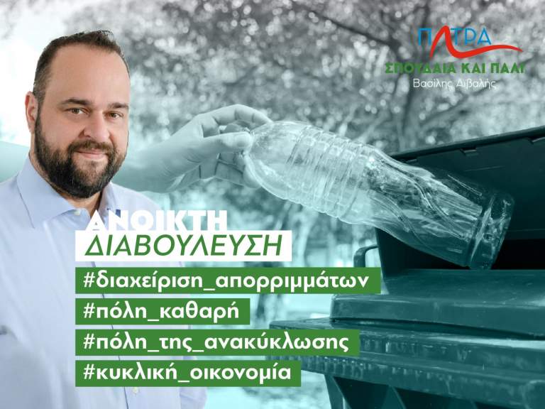 Η ενότητα «Διαχείριση απορριμμάτων» τίθεται από σήμερα σε δημόσια διαβούλευση από την παράταξη «Πάτρα, Σπουδαία και Πάλι» με επικεφαλής με τον υποψήφιο δήμαρχο Πατρέων Βασίλη Αϊβαλή. Η διαβούλευση πραγματοποιείται μέσω της ηλεκτρονικής σελίδας της παράταξης www.vasilisaivalis.gr.