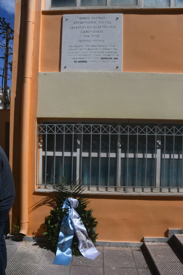 Συμπληρώθηκαν 58 χρόνια από το στρατιωτικό πραξικόπημα της 21ης Απριλίου και η Δημοτική Αρχή, όπως κάθε χρόνο, τιμά τους αγωνιστές που φυλακίστηκαν, βασανίστηκαν και εξορίστηκαν κατά την διάρκεια της επτάχρονης δικτατορίας, στα Δημοτικά Σχολεία Αγίας Σοφίας και Δροσιάς, στην Πάτρα, που είχαν μετατραπεί, από το καθεστώς των Συνταγματαρχών, σε χώρους φυλάκισης των αγωνιστών που όρθωσαν το ανάστημά τους και δεν έσκυψαν το κεφάλι στη δικτατορία.