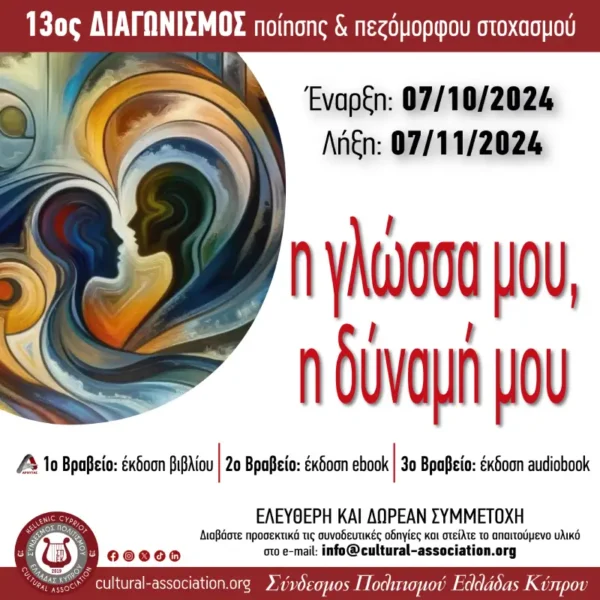 Ο Σύνδεσμος Πολιτισμού Ελλάδας Κύπρου | Σ.Π.Ε.Κ. προκηρύσσει τον 13ο ΔΙΑΓΩΝΙΣΜΟ Ποίησης και Πεζόμορφου Στοχασμού με τίτλο “Η Γλώσσα μου, η δύναμή μου”. Έναρξη Διαγωνισμού 07/10/2024. Λήξη Διαγωνισμού 07/11/2024. Ελεύθερη και Δωρεάν Συμμετοχή. Πρώτο Βραβείο: έκδοση βιβλίου. Δεύτερο Βραβείο: έκδοση eBook. Τρίτο Βραβείο: έκδοση audiobook. Διαβάστε προσεχτικά τις συνοδευτικές οδηγίες και στείλτε το απαιτούμενο υλικό στο email: [email protected]