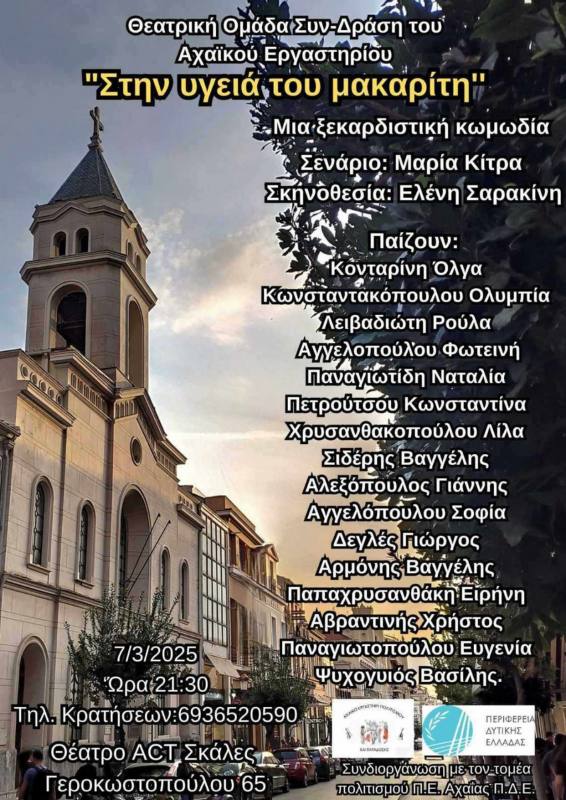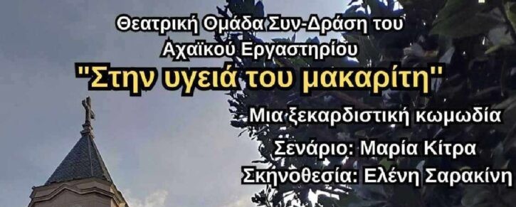 Το Αχαϊκό Εργαστήρι Πολιτισμού & Παράδοσης και η θεατρική του ομάδα «Συν-Δράση», σε συνεργασία με την Περιφέρεια Δυτικής Ελλάδας, παρουσιάζουν την παράσταση «Στην υγειά του μακαρίτη» την Παρασκευή 7 Μαρτίου 2025, στις 9:30μ.μ., στο θέατρο ACT στην Πάτρα.