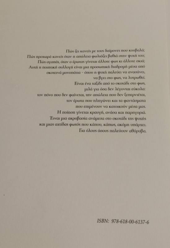 Φανταστείτε έναν ακροβάτη ξυπόλητο πάνω σε σχοινί, να κινείται ανάμεσα στο φως και το σκοτάδι. Προσπαθεί να βρει την ισορροπία μέσα του, ώστε να μην χαθεί ούτε στις σκιές ούτε στο φως. Αυτή η εικόνα, που αποτυπώνεται και στο εξώφυλλο από την κα Αθανασοπούλου Πάτρα, είναι η καρδιά της συλλογής μου, ένας αέναος χορός ανάμεσα στη δύναμη και την ευαλωτότητα, το σκοτάδι και το φως. Και οι δυο αντίρροπες καταστάσεις χρειάζονται στη ζωή μας, ώστε να μπορέσουμε να εξελιχθούμε. Οι δύσκολες καταστάσεις μάς κάνουν πιο δυνατούς, ο δρόμος προς το φως είναι πάντα δύσβατος, αλλά καθοριστικός για την εξέλιξή μας.
