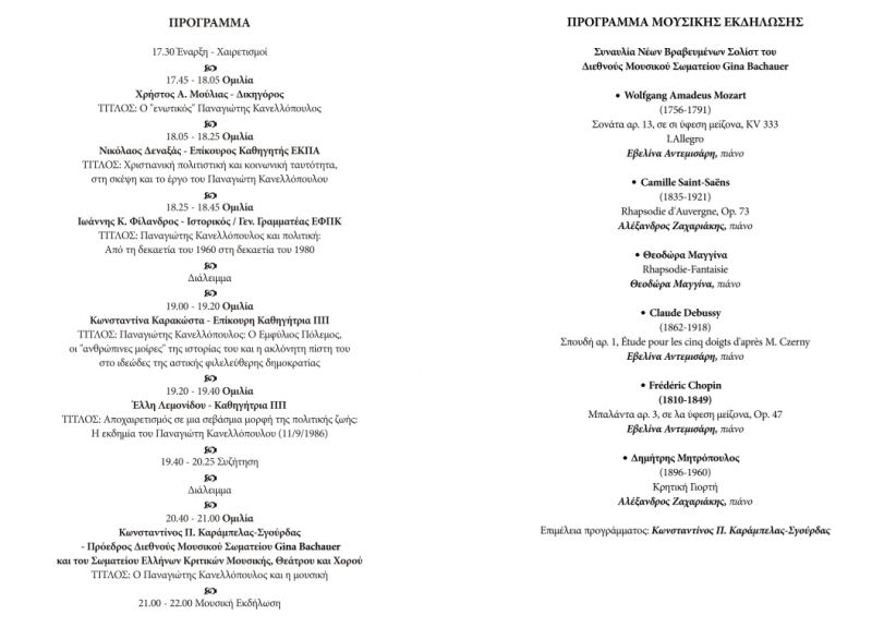 Το πρόγραμμα(17.30 – 21.00) περιλαμβάνει εισηγήσεις που φωτίζουν ποικίλες όψεις της προσωπικότητας και του έργου του Π. Κανελλόπουλου: ο δικηγόρος κ. Χρήστος Α. Μούλιας θα αναφερθεί στον «ενωτικό» χαρακτήρα του, ο επίκ. καθηγητής κ. Νικόλαος Δεναξάς στη χριστιανική πολιτιστική και κοινωνική ταυτότητα στη σκέψη του, ενώ ο ιστορικός κ. Ιωάννης Κ. Φίλανδρος θα εξετάσει την πολιτική του πορεία από τη δεκαετία του 1960 έως το 1980. Στη συνέχεια, η επίκ. καθηγήτρια κα Κωνσταντίνα Καρακώστα θα παρουσιάσει τις θέσεις του για τον Εμφύλιο και τη δημοκρατία, ενώ η καθηγήτρια κα Έλλη Λεμονίδου θα αναφερθεί στην εκδημία του και στην πολιτική του παρακαταθήκη. Θα ακολουθήσει συζήτηση με το κοινό.