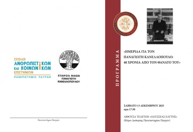 Η Σχολή Ανθρωπιστικών και Κοινωνικών Επιστημών του Πανεπιστημίου Πατρών, σε συνεργασία με την Εταιρεία Φίλων Παναγιώτη Κανελλόπουλου, διοργανώνει ημερίδα αφιερωμένη στη μνήμη του Παναγιώτη Κανελλόπουλου, με αφορμή τη συμπλήρωση 40 ετών από τον θάνατό του. Η εκδήλωση θα πραγματοποιηθεί το Σάββατο 13 Δεκεμβρίου 2025, στις 17.30, στην Αίθουσα Τελετών «Οδυσσέας Ελύτης» του Κτιρίου Διοίκησης του Πανεπιστημίου Πατρών.