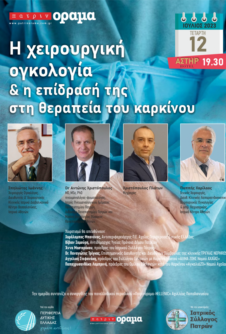 Το πανελλαδικό περιοδικό «Πατρινόραμα-HELLENIC» πραγματοποιεί ημερίδα με θέμα: «Η χειρουργική ογκολογία και η επίδρασή της στη θεραπεία του Καρκίνου» προς ενημέρωση του κοινού.