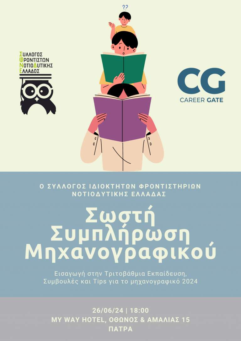 O Σύλλογος Ιδιοκτητών Φροντιστηρίων Νοτιοδυτικής Ελλάδας διοργανώνει στην Πάτρα ημερίδα με τίτλο «Σωστή συμπλήρωση μηχανογραφικού», την Τετάρτη 26 ΙΟΥΝΙΟΥ 2024 και ώρα 18:00 στο Ξενοδοχείο MYWAY HOTEL AND EVENTS, αίθουσα εκδηλώσεων με προσκεκλημένο το κ.Κωνσταντίνο Κατσανέβα από την Career Gate.