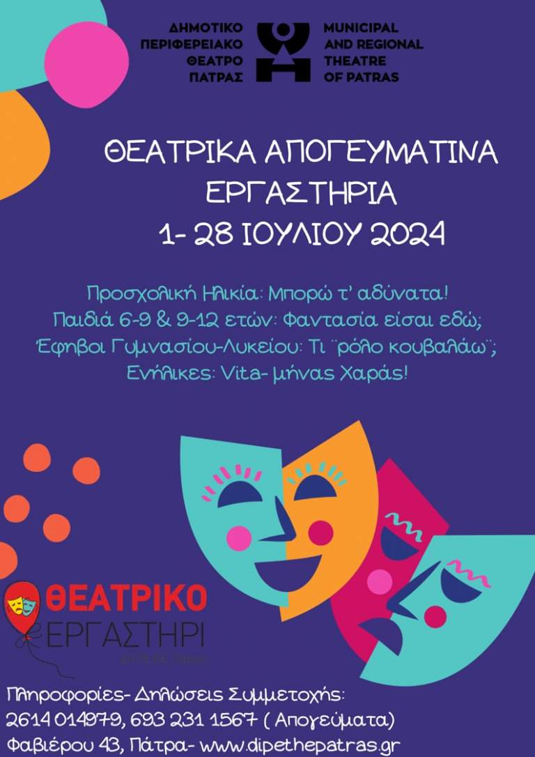 Το Θεατρικό Εργαστήρι του ΔΗ.ΠΕ.ΘΕ. Πάτρας, διοργανώνει καλοκαιρινά θεατρικά εργαστήρια για όλες τις ηλικίες, τον μήνα Ιούλιο! Στόχος η θεατρική εκπαίδευση σε συμπυκνωμένες δράσεις και συγκεκριμένες θεματικές.