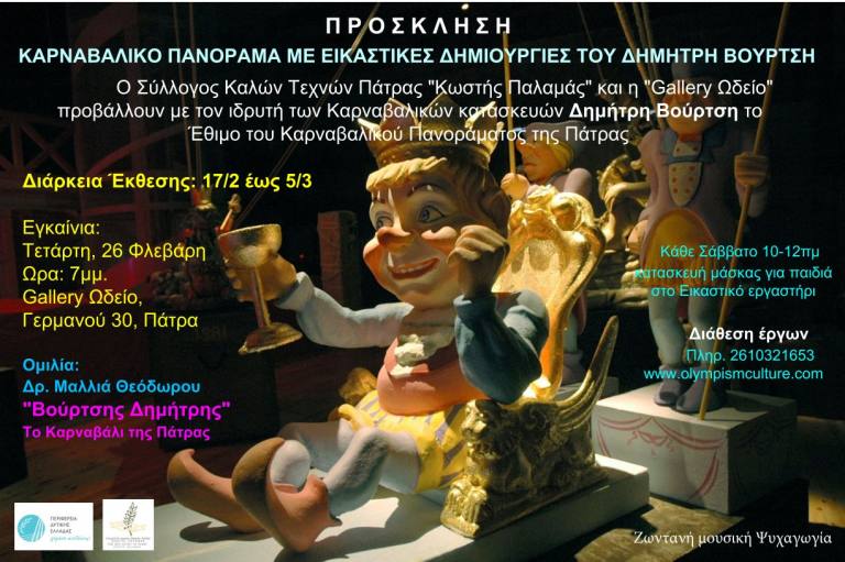 Ο ΣΥΛΛΟΓΟΣ ΚΑΛΩΝ ΤΕΧΝΩΝ ΠΑΤΡΑΣ ΚΩΣΤΗΣ ΠΑΛΑΜΑΣ & Η «GALLERY ΩΔΕΙΟ» ΤΟΥ ΚΕΝΤΡΟΥ ΠΟΛΙΤΙΣΜΟΥ-ΟΛΥΜΠΙΣΜΟΥ ΚΩΣΤΗΣ ΠΑΛΑΜΑΣ ΑΝΑΒΙΩΝΟΥΝ ΤΟ ΠΑΤΡΑΙΚΟ ΕΘΙΜΟ ΚΑΙ ΑΝΑΔΕΙΚΝΥΟΥΝ ΤΟ ΚΑΡΝΑΒΑΛΙΚΟ ΠΑΝΟΡΑΜΑ ΤΟΥ ΔΗΜΗΤΡΗ ΒΟΥΡΤΣΗ