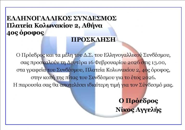 Ο Πρόεδρος και τα μέλη του Διοικητικού Συμβουλίου του Ελληνογαλλικού Συνδέσμου διοργανώνουν την καθιερωμένη κοπή της πρωτοχρονιάτικης πίτας για το έτος 2026, τη Δευτέρα 16 Φεβρουαρίου 2026 και ώρα 13:00, στα γραφεία του Συνδέσμου (Πλατεία Κολωνακίου 2, 4ος όροφος, Αθήνα).