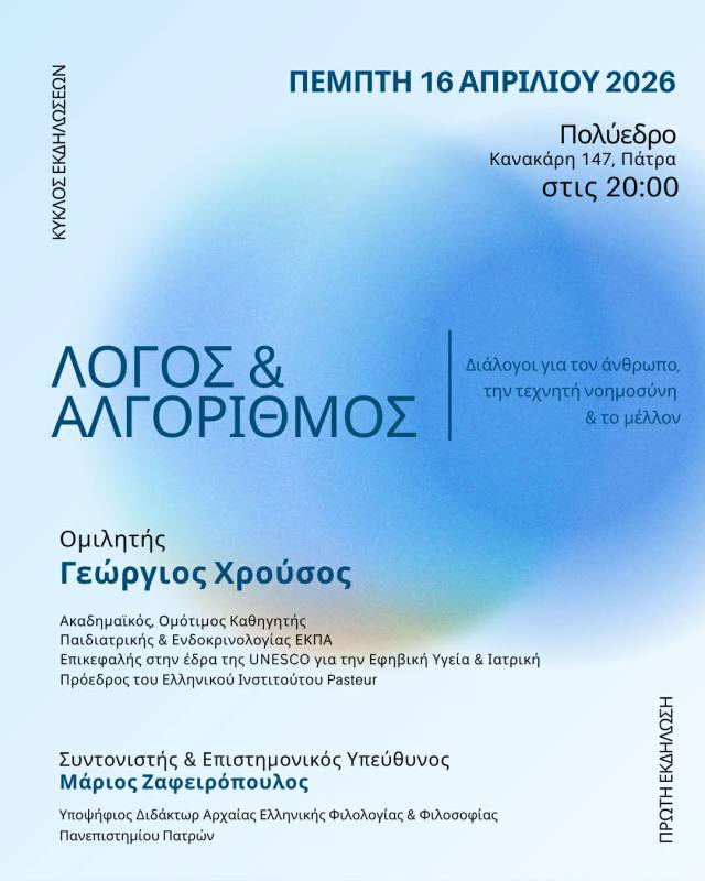 Αρχίζει ο Κύκλος Εκδηλώσεων «Λόγος & Αλγόριθμος: Διάλογοι για τον άνθρωπο, την τεχνητή νοημοσύνη και το μέλλον» με τον Καθηγητή Γεώργιο Χρούσο, στο Πολύεδρο, την Πέμπτη 16 Απριλίου, στις 8 το βράδυ.