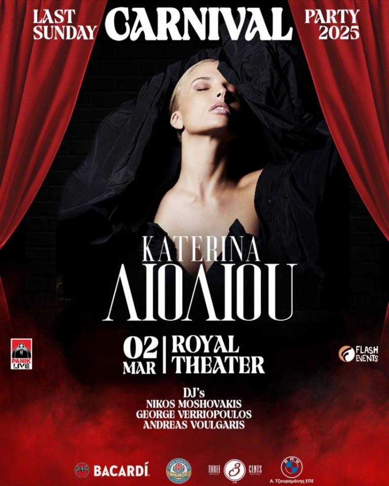 Tο κορυφαίο live party λήξης του Πατρινού καρναβαλιού έρχεται πιο δυνατό απο ποτέ και σας προσκαλεί σε ένα μοναδικό πάρτι μασκέ με καλεσμένη την Κατερίνα Λιόλιου την οποία θα πλαισιώσουν πριν και μετά το Live οι συνήθεις ύποπτοι Γιώργος Βερροιόπουλος, Νίκος Μοσχοβάκης και Ανδρέας Βούλγαρης με όλες τις καρναβαλικές και mainsteam επιτυχίες!