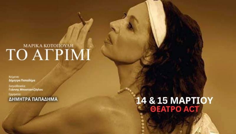 Το Αγρίμι, η Μαρίκα Κοτοπούλη, η μεγάλη ιέρεια του θεάτρου, η παθιασμένη, η ασυμβίβαστη, η ελεύθερη γυναίκα, το γεννημένο «αγοροκόριτσο» έρχεται μόνο για δύο παραστάσεις στη σκηνή του θεάτρου act, το Σάββατο 14/3 και την Κυριακή 15/3 για να πει όσα έχει να πει, έξω από τα δόντια.