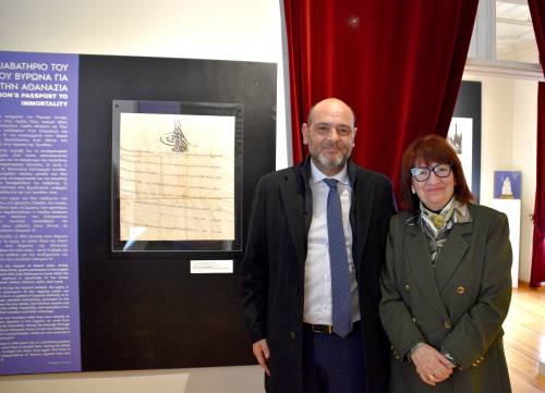 Με ιδιαίτερα συγκίνηση και χαρά πραγματοποιήθηκαν τα εγκαίνια της έκθεσης δύο αυθεντικών κειμηλίων από τη Βυρωνική Εταιρεία Ιεράς Πόλεως Μεσολογγίου
