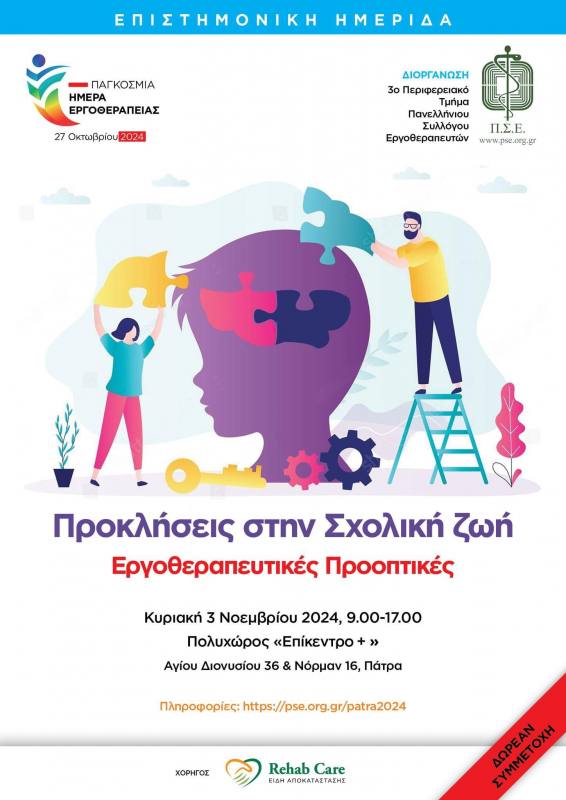 Ειδικότερα φέτος οργανωθήκαν 3 προσυνεδριακές Ημερίδες και Διημερίδες, μια σε κάθε Περιφερειακό Τμήμα του ΠΣΕ. Το 1 ο Π.Τ. οργάνωσε την Διημερίδα: «Εργοθεραπεία για Όλους» η οποία πραγματοποιήθηκε με μεγάλη επιτυχία στις 26 και 27 Οκτωβρίου στο Ηράκλειο Κρήτης. Το 2 ο Π.Τ. διοργανώνει Διημερίδα με τίτλο: «Εργοθεραπεία: Νέα Δεδομένα και Προοπτικές» στις 23 και 24 Νοέμβριου 2024 στην Θεσσαλονίκη ενώ το δικό μας 3 ο Π.Τ. διοργανώνει Ημερίδα με τίτλο : «Προκλήσεις στην Σχολική Ζωή – Εργοθεραπευτικές Προοπτικές» στις 3 Νοεμβρίου στην Πάτρα στον Πολυχώρο «Επίκεντρο+». Θα μιλήσουν καταξιωμένοι επιστήμονες από διάφορες Ειδικότητες (Παιδοψυχίατρος, Αναπτυξιολόγος, Εργοθεραπευτές, Λογοθεραπευτές, Ειδική Παιδαγωγός, Ψυχολόγος, Γυμναστής Ειδικής Αγωγής, Φυσικοθεραπευτής, Εκπαιδευτικός κ.α.) και απευθύνεται σε γονείς, εκπαιδευτικούς και επαγγελματίες υγείας. Η συμμετοχή είναι δωρεάν, ενώ είναι απαραίτητο όποιος θέλει να παρακολουθήσει την ημερίδα μας, να κάνει εγγραφή ακολουθώντας τον σύνδεσμο: https://pse.org.gr/patra2024/ ή στον χώρο της ημερίδας κατά την έναρξη. Είμαστε πολύ χαρούμενοι διότι υπάρχει μεγάλο ενδιαφέρον και συμμετοχή!