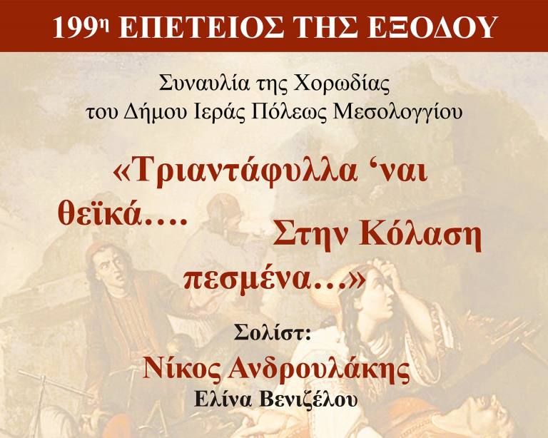 Με τίτλο «Τριαντάφυλλα ’ναι θεϊκά… Στην Κόλαση πεσμένα…», η εκδήλωση αποτίνει φόρο τιμής στη θυσία των Ελεύθερων Πολιορκημένων, συνδέοντας την ιστορία του Μεσολογγίου με τη δύναμη της μουσικής.