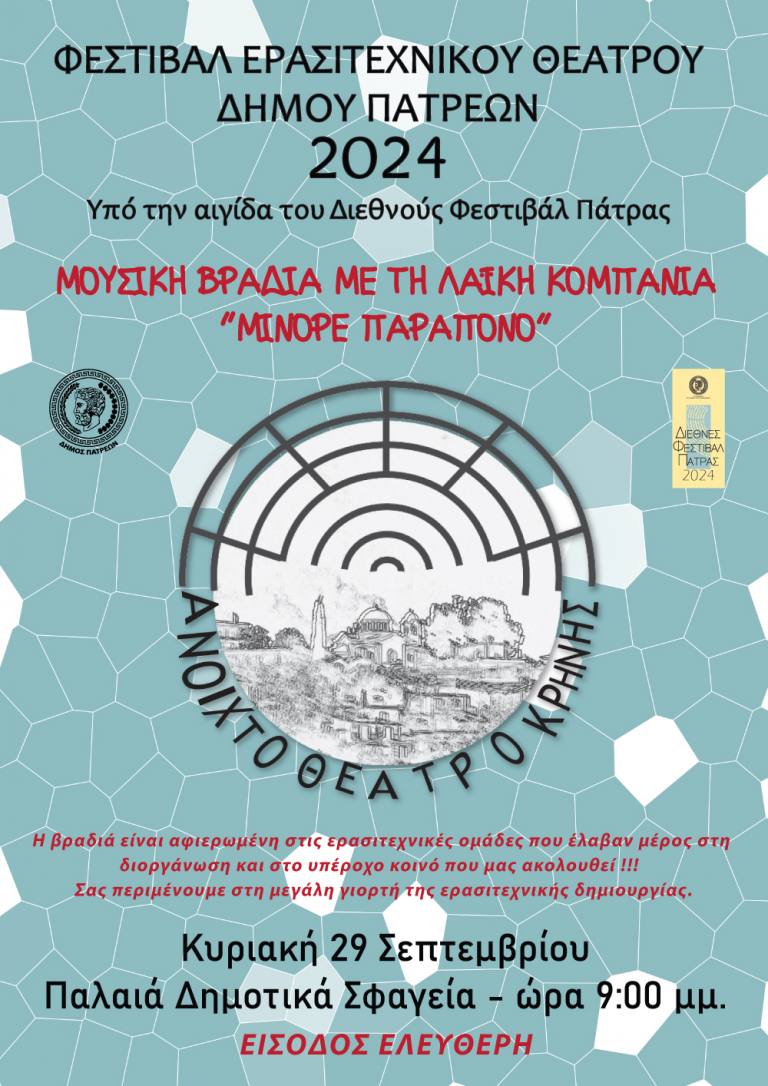 Η αυλαία της φετινής ενότητας του Φεστιβάλ Ερασιτεχνικού Θεάτρου κλείνει και τυπικά στις 9.00 το βράδυ της Κυριακής 29 Σεπτεμβρίου στο χώρο των «Παλαιών Σφαγείων» με την πραγματοποίηση ανοιχτής μουσικής βραδιάς από το μουσικό σχήμα «Μινόρε παράπονο».