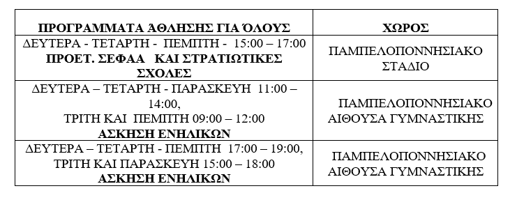 Συγκεκριμένα θα υλοποιηθούν τα προγράμματα: «Άσκηση Ενηλίκων», «Πρόγραμμα Προετοιμασίας για Στρατιωτικές Σχολές και ΣΕΦΑΑ».
