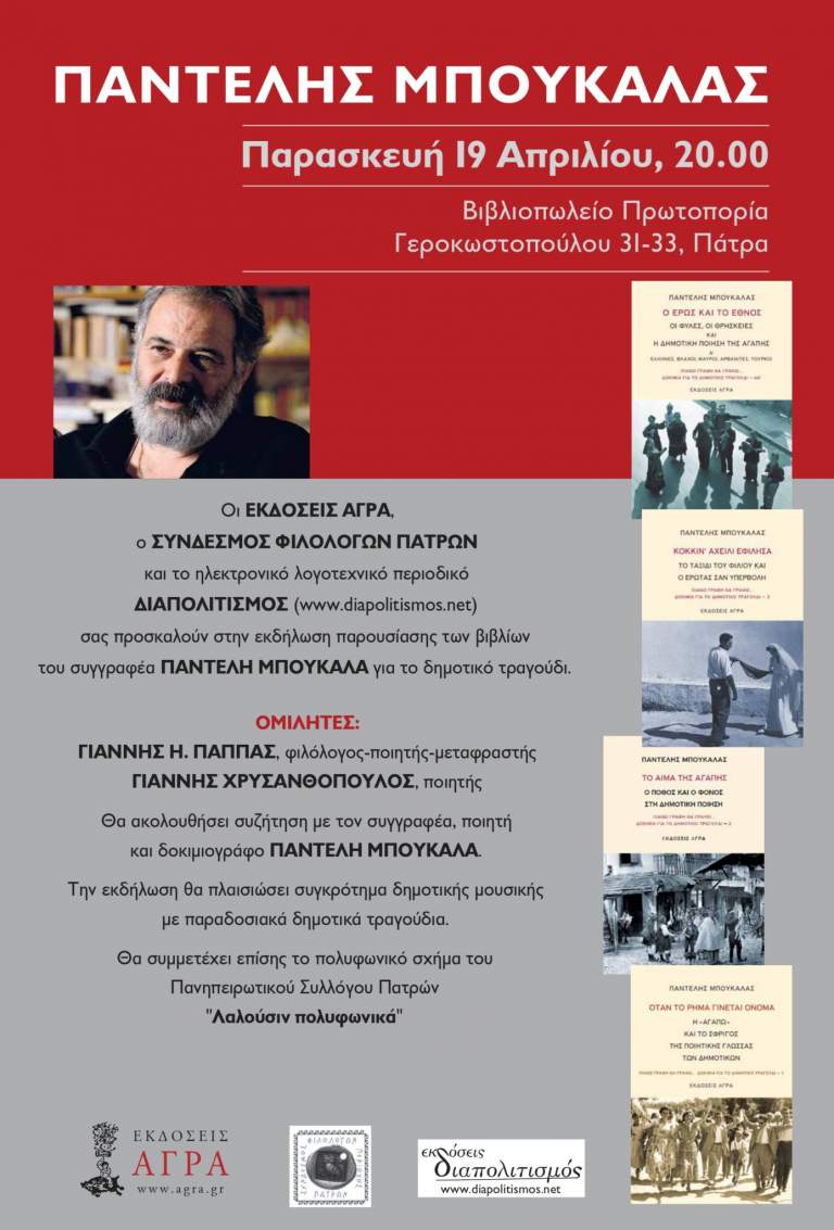 Οι Εκδόσεις Άγρα, ο Σύνδεσμος Φιλολόγων Περιοχής Πατρών και το Ηλεκτρονικό λογοτεχνικό περιοδικό Διαπολιτισμός (www.diapolitismos.net) διοργανώνουν εκδήλωση που θα γίνει την Παρασκευή 19 Απριλίου 2024 στον χώρο του βιβλιοπωλείου Πρωτοπορία (Γεροκωστοπούλου 31-33, Πάτρα) για την παρουσίαση των βιβλίων του συγγραφέα Παντελή Μπουκάλα για το δημοτικό τραγούδι.