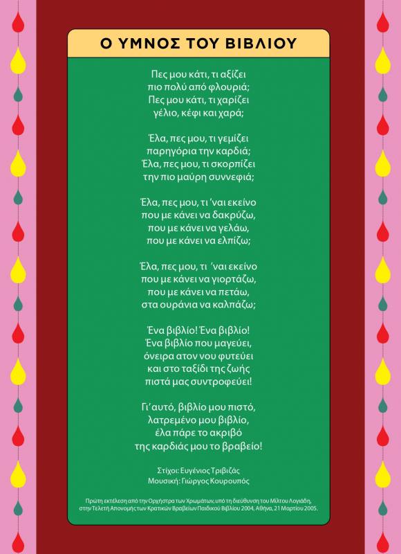 Home Πολιτισμός Ο “ΥΜΝΟΣ ΤΟΥ ΒΙΒΛΙΟΥ” του ΕΥΓΕΝΙΟΥ ΤΡΙΒΙΖΑ για την “ΠΑΓΚΟΣΜΙΑ ΗΜΕΡΑ ΠΑΙΔΙΚΟΥ ΒΙΒΛΙΟΥ”.Patrinorama Magazine·3 Απριλίου, 2025Πολιτισμός·0 Comments·1 min read·0 Ο «ΥΜΝΟΣ ΤΟΥ ΒΙΒΛΙΟΥ» του Ευγένιου Τριβιζά για τη σημερινή Παγκόσμια Ημέρα Παιδικού Βιβλίου.