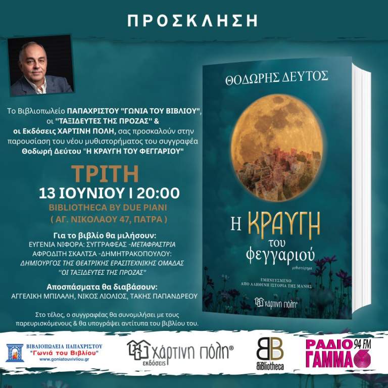 Οι εκδόσεις ΧΑΡΤΙΝΗ ΠΟΛΗ – ΤΟ ΒΙΒΛΙΟΠΩΛΕΙΟ ΠΑΠΑΧΡΙΣΤΟΥ – ΓΩΝΙΑ ΤΟΥ ΒΙΒΛΙΟΥ και οι ”ΤΑΞΙΔΕΥΤΕΣ ΤΗΣ ΠΡΟΖΑΣ” σας προσκαλούν στην παρουσίαση του νέου μυθιστορήματος του συγγραφέα ΘΟΔΩΡΗ ΔΕΥΤΟΥ “Η ΚΡΑΥΓΗ ΤΟΥ ΦΕΓΓΑΡΙΟΥ” το οποίο είναι εμπνευσμένο από αληθινή ιστορία της ΜΑΝΗΣ την ΤΡΙΤΗ 13 /06 /23 και ώρα 20:00 στο BIBLIOTHECA BY DUE PIANI ( ΑΓ. ΝΙΚΟΛΑΟΥ 47, ΠΑΤΡΑ ).
