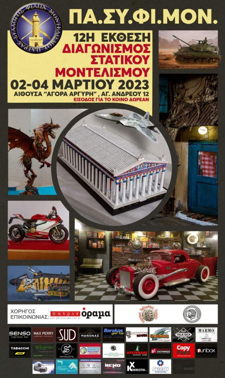 Φιλοδοξούν να αναδείξουν και αυτήν την πολιτιστική δράση των Πατρινών, αλλά και να κάνουν την πόλη μας, σημείο συνάντησης μοντελιστών από όλη την Ελλάδα και την Ευρώπη, διοργανώνοντας την 12η Έκθεση/ Διαγωνισμό Στατικού Μοντελισμού , από την Πέμπτη 02 Μαρτίου έως και το Σάββατο 04 Μαρτίου 2023 .