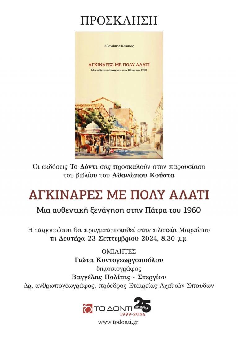 Την Δευτέρα 23 Σεπτεμβρίου 2024, στις 8:30 μ.μ. στην πλατεία Μαρκάτου παρουσιάζεται το νέο βιβλίο του Θανάση Κούστα “Αγκινάρες με πολύ αλάτι”.