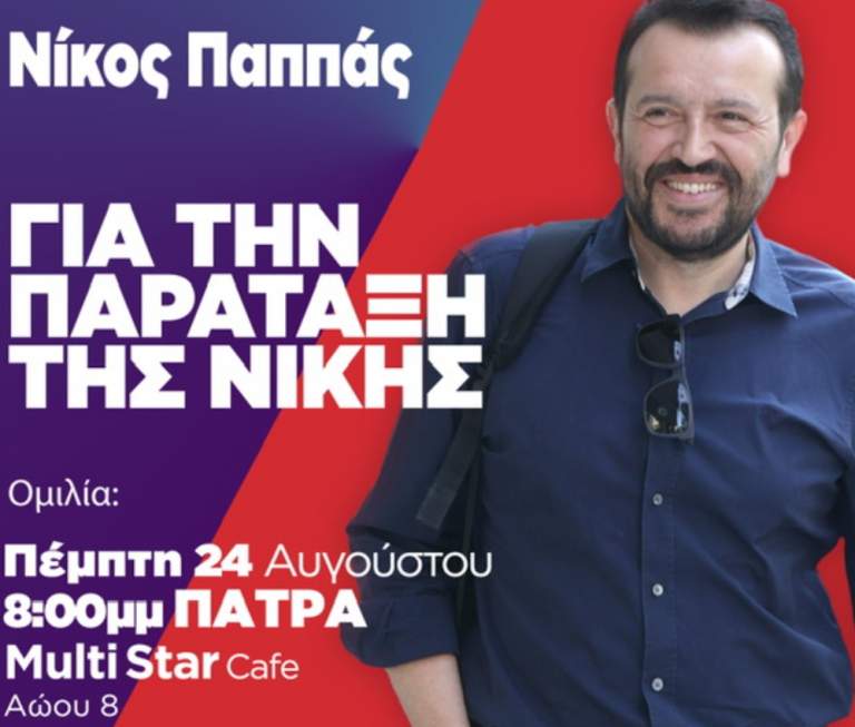 “Την Πέμπτη 24.8 ο υποψήφιος Πρόεδρος του ΣΥΡΙΖΑ – Προοδευτική Συμμαχία Νίκος Παππάς, στο πλαίσιο της περιοδείας του στην Αχαΐα θα επισκεφθεί την Πάτρα και σας προσκαλεί: