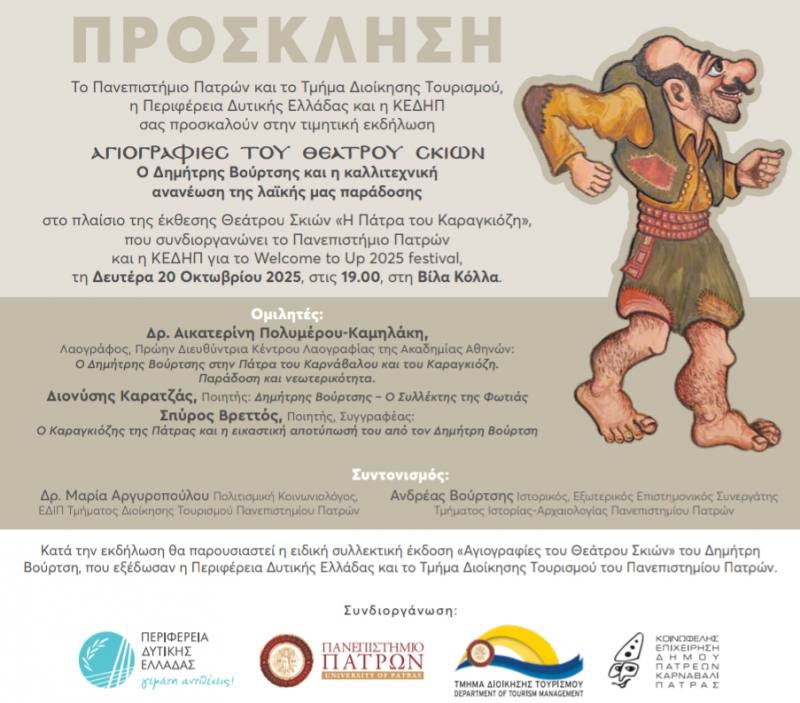 Η εκδήλωση διοργανώνεται από το Πανεπιστήμιο Πατρών και το Τμήμα Διοίκησης Τουρισμού, σε συνεργασία με την Περιφέρεια Δυτικής Ελλάδας και την Κοινωφελή Επιχείρηση Δήμου Πατρέων – Καρναβάλι Πάτρας (ΚΕΔΗΠ), στο πλαίσιο της μεγάλης έκθεσης Θεάτρου Σκιών «Η Πάτρα του Καραγκιόζη», που υλοποιείται σε συνδιοργάνωση με το Welcome to Up 2025 Festival.