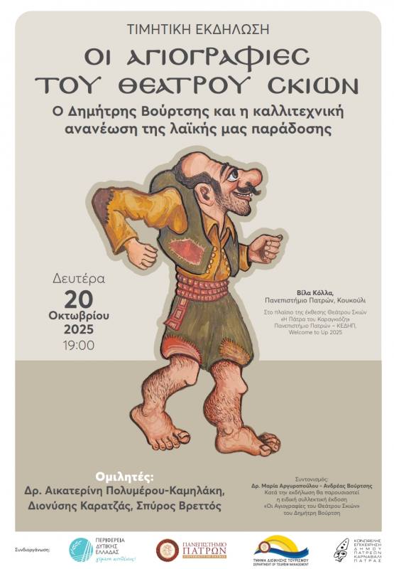 Την Δευτέρα 20 Οκτωβρίου 2025 η Πάτρα υποδέχεται μια ξεχωριστή πολιτιστική βραδιά, αφιερωμένη στην ανανέωση της λαϊκής μας παράδοσης και στη διαχρονική γοητεία του Θεάτρου Σκιών. Στις 19:00, στη Βίλα Κόλλα του Πανεπιστημίου Πατρών (περιοχή Κουκούλι), πραγματοποιείται η τιμητική εκδήλωση με τίτλο «Οι Αγιογραφίες του Θεάτρου Σκιών — Ο Δημήτρης Βούρτσης και η καλλιτεχνική ανανέωση της λαϊκής μας παράδοσης».