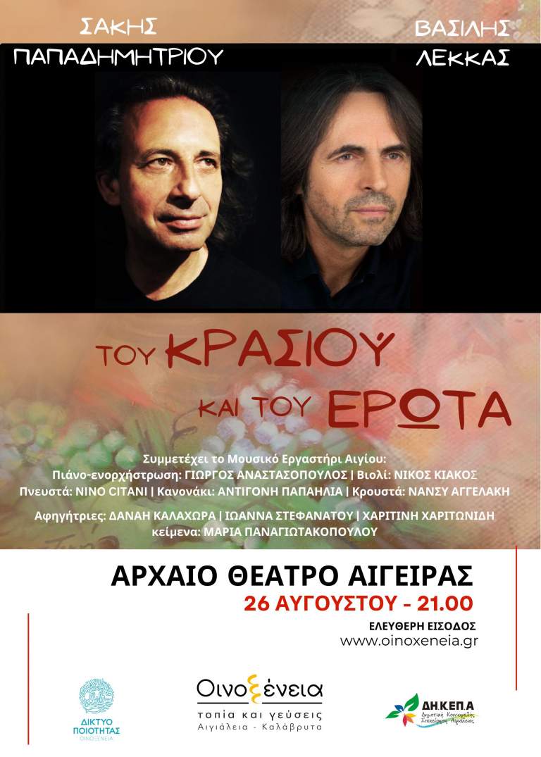 ΟΙΝΟΞΕΝΕΙΑ 2023 «ΤΟΥ ΚΡΑΣΙΟΥ ΚΑΙ ΤΟΥ ΕΡΩΤΑ»  Αρχαία λυρική ποίηση από τους Σάκη Παπαδημητρίου – Βασίλη Λέκκα στο Αρχαίο θέατρο της Αιγείρας το  Σάββατο, 26 Αυγούστου στις  9 μ.μ.