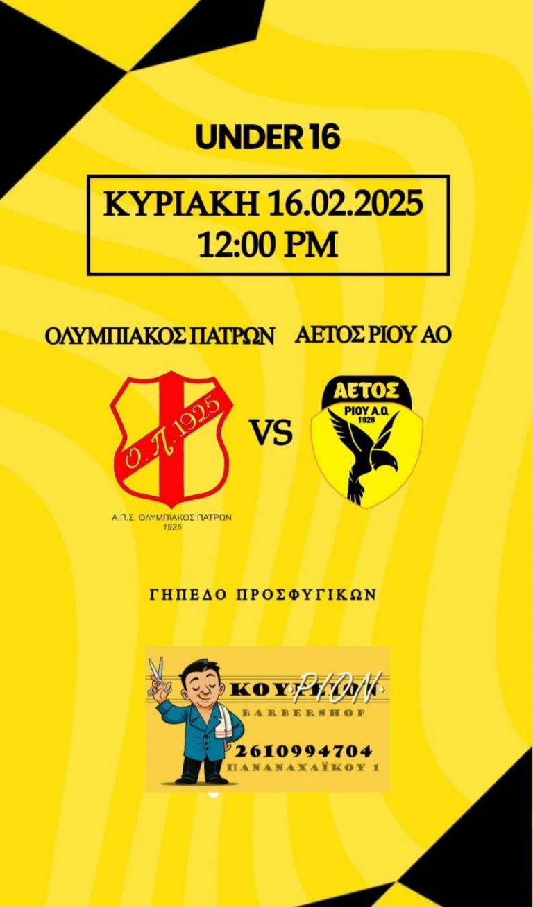 Η Κ16 του Αετού Ρίου αγωνίζεται για την 7η Αγωνιστική του Πρωταθλήματος με τον Ολυμπιακό Πατρών. Κυριακή στις 12:00 στα Προσφυγικά.