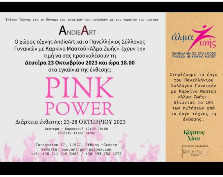 Ο Χώρος Τέχνης «Andie Art» ανοίγει τις πόρτες του τη Δευτέρα 23 Οκτωβρίου στις 18:00 για την ομαδική έκθεση «Pink Power». Με αφορμή την παγκόσμια ημέρα κατά του καρκίνου του μαστού, η έκθεση έχει ως κυρίαρχο θέμα τη γυναικεία δύναμη, το ροζ χρώμα και την επιβίωση από τον καρκίνο. Η έκθεση θα διαρκέσει έως τις 28 Οκτωβρίου.