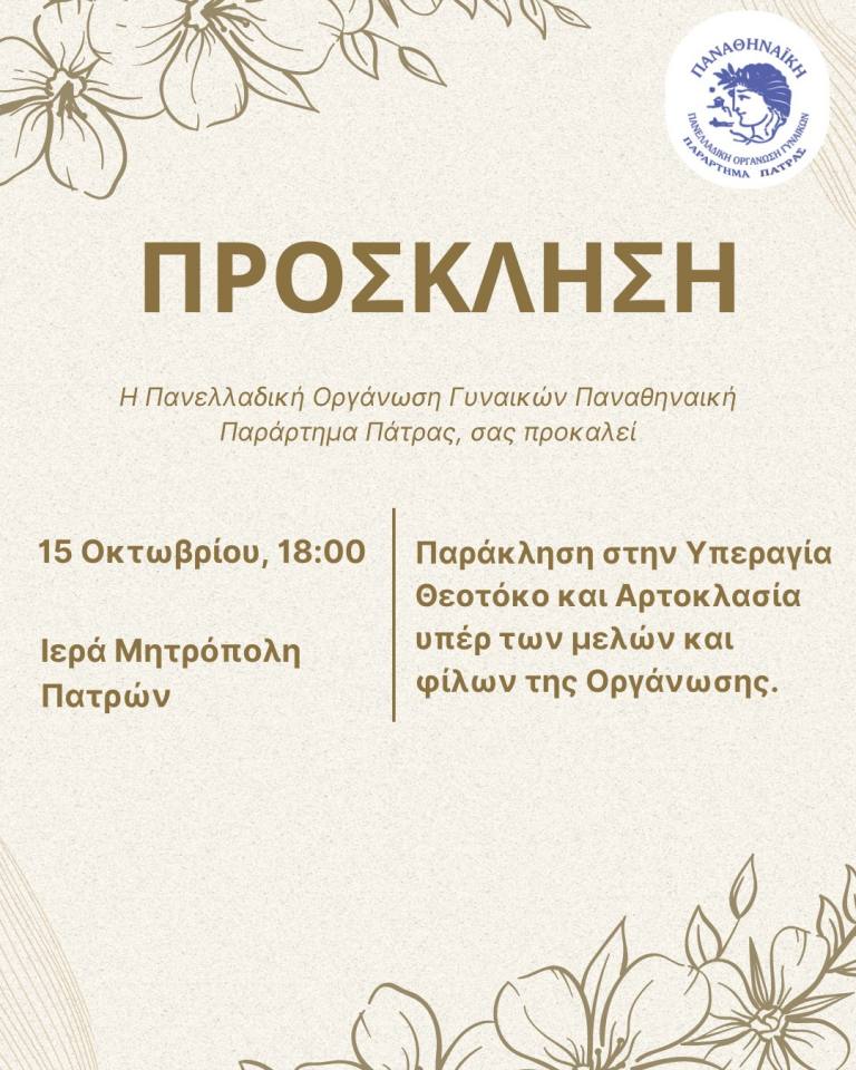 Η Πανελλαδική Οργάνωση Γυναικών Παναθηναϊκή Παράρτημα Πάτρας, σας προσκαλεί την 15η Οκτωβρίου 2025 ώρα 6 το απόγευμα στην Μητρόπολη Πατρών.