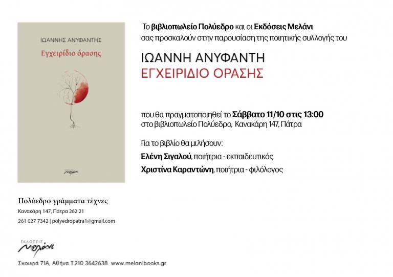 Παρουσιάζεται στο Πολύεδρο, το Σάββατο 11 Οκτωβρίου, στη 1 το μεσημέρι, η ποιητική συλλογή «Εγχειρίδιο όρασης» του Ιωάννη Ανυφαντή, που κυκλοφορεί από τις εκδόσεις Μελάνι.