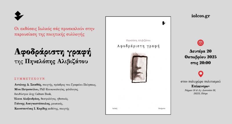 Οι εκδόσεις Ιωλκός σάς προσκαλούν στην παρουσίαση της ποιητικής συλλογής «Αφοδράριστη γραφή» της Πηνελόπης Αλιβιζάτου, τη Δευτέρα 20 Οκτωβρίου 2025 στις 20:00, στον πολυχώρο πολιτισμού Επίκεντρο+ (Νόρμαν 16 & Αγ. Διονυσίου 36, 26223, Πάτρα).