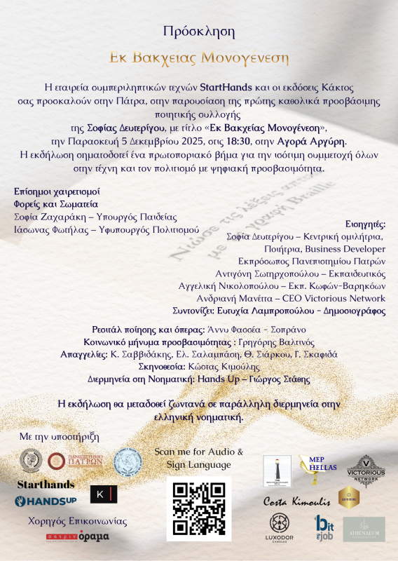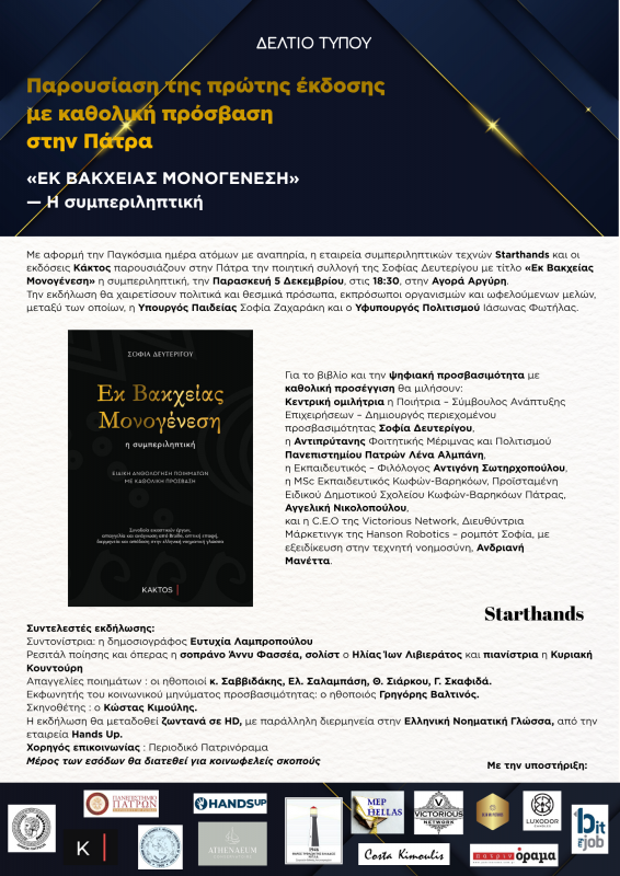 H εταιρεία συμπεριληπτικών τεχνών Starthands και οι εκδόσεις Κάκτος παρουσιάζουν στην Πάτρα την ποιητική συλλογή της Σοφίας Δευτερίγου με τίτλο «Εκ Βακχείας Μονογένεση» η συμπεριληπτική, την Παρασκευή 5 Δεκεμβρίου, στις 18:30, στην Αγορά Αργύρη.Στην εκδήλωση θα απευθύνουν χαιρετισμό πολιτικά και θεσμικά πρόσωπα, εκπρόσωποι οργανισμών και ωφελούμενων μελών, μεταξύ των οποίων, η Υπουργός Παιδείας Σοφία Ζαχαράκη και ο Υφυπουργός Πολιτισμού Ιάσωνας Φωτήλας.