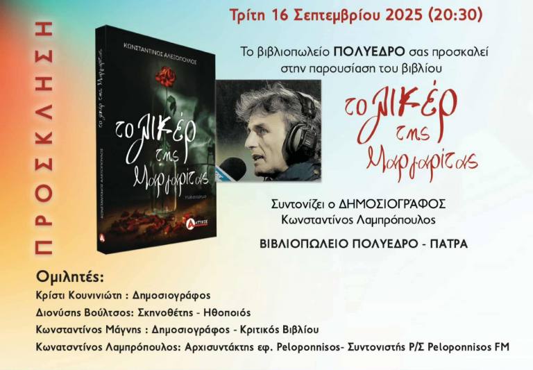 Παρουσιάζεται στο Πολύεδρο, την Τρίτη 16 Σεπτεμβρίου, στις 8:30 το βράδυ, το νέο βιβλίο του Κωνσταντίνου Αλεξόπουλου «Το λικέρ της Μαργαρίτας», που κυκλοφορεί από τις εκδόσεις Αττικός.