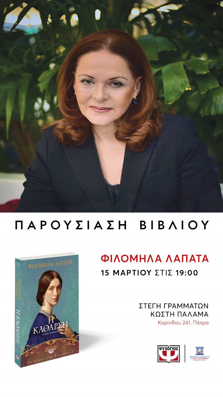 Το Σάββατο 15 Μαρτίου και ώρα 19:00 η Πάτρα υποδέχεται στην Στέγη Γραμμάτων ΚΩΣΤΗΣ ΠΑΛΑΜΑΣ (Κορίνθου 241) , την συγγραφέα Φιλομήλα Λαπατά, για την παρουσίαση του βιβλιου της
