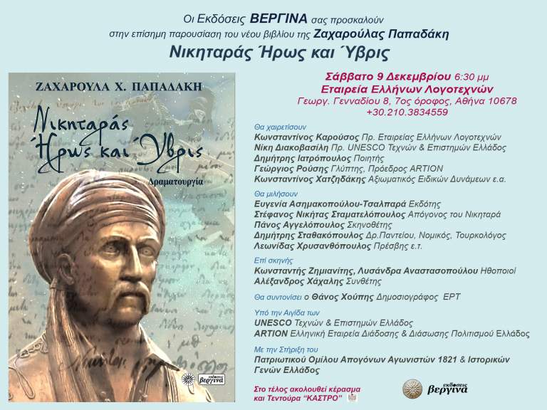 Οι εκδόσεις Βεργίνα σας προσκαλούν στην παρουσίαση του βιβλίου της συγγραφέως Ζαχαρούλας Παπαδάκη «ΝΙΚΗΤΑΡΑΣ ΗΡΩΣ ΚΑΙ ΥΒΡΙΣ» που θα πραγματοποιηθεί το Σάββατο 9 Δεκεμβρίου 2023, στις 6:30 μ.μ. στην Ένωση Ελλήνων Λογοτεχνών (Γενναδίου 8 Αθήνα τ.κ.10678 7ος όροφος τηλ.+30 210 3834559)