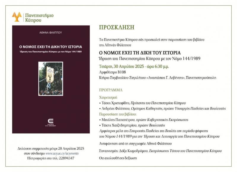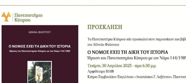 Το Πανεπιστήμιο Κύπρου παρουσιάζει το βιβλίο με τίτλο «Ο ΝΟΜΟΣ ΕΧΕΙ ΤΗ ΔΙΚΗ ΤΟΥ ΙΣΤΟΡΙΑ» και υπότιτλο «Ίδρυση του Πανεπιστημίου Κύπρου με τον Νόμο 144/1989». Η συγγραφέας Αθηνά Φιλίππου εστιάζει κυρίως στη χρονική περίοδο της ίδρυσης του Πανεπιστημίου Κύπρου και στις πολιτικές διεργασίες που συντελέστηκαν από την εκτελεστική και νομοθετική εξουσία. Το βιβλίο ξεκινά με την περιγραφή της περιρρέουσας ατμόσφαιρας το 1989 και συνεχίζει με τη σύσταση της Προπαρασκευαστικής Επιτροπής για την Ίδρυση του Πανεπιστημίου.