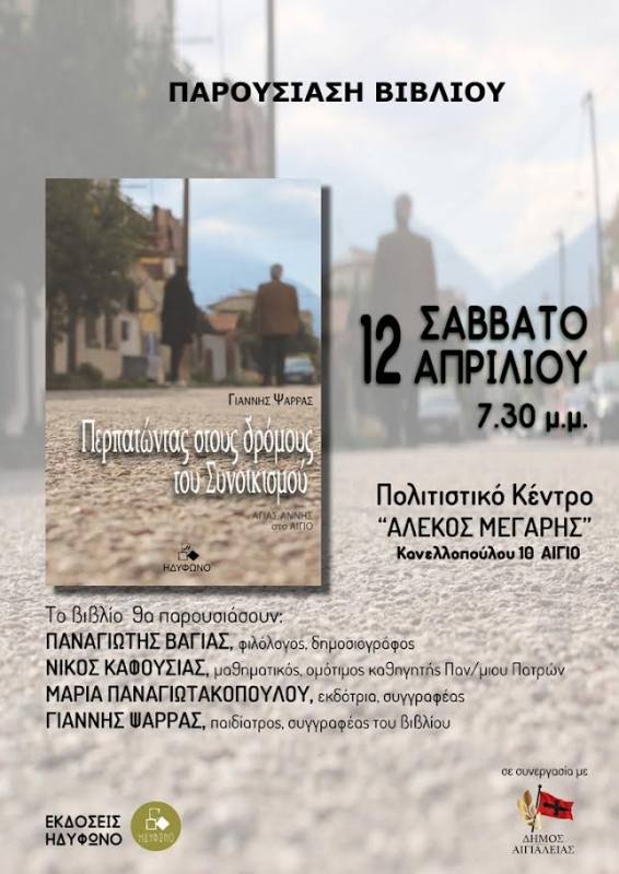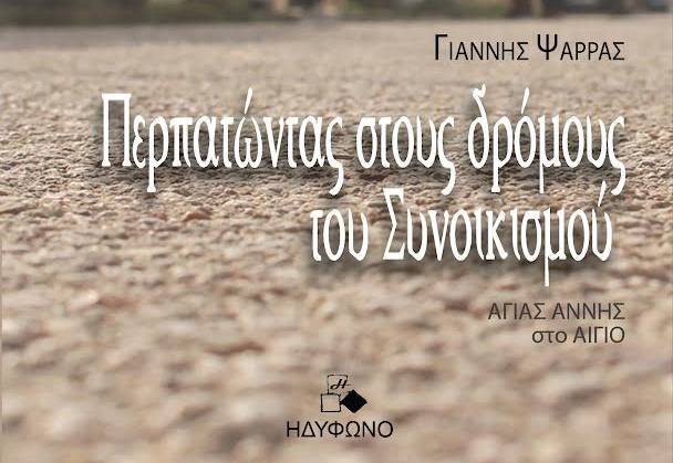 Παρουσιάζεται το Σάββατο 12 Απριλίου, στις 7.30μ.μ.  στο Πολιτιστικό Κέντρο Αιγίου «Αλέκος Μέγαρης», το βιβλίο του Γιάννη Ψαρρά «Περπατώντας στους δρόμους του Συνοικισμού (Αγίας Άννης Αίγιο)» που κυκλοφορεί από τις εκδόσεις ΗΔΥΦΩΝΟ.