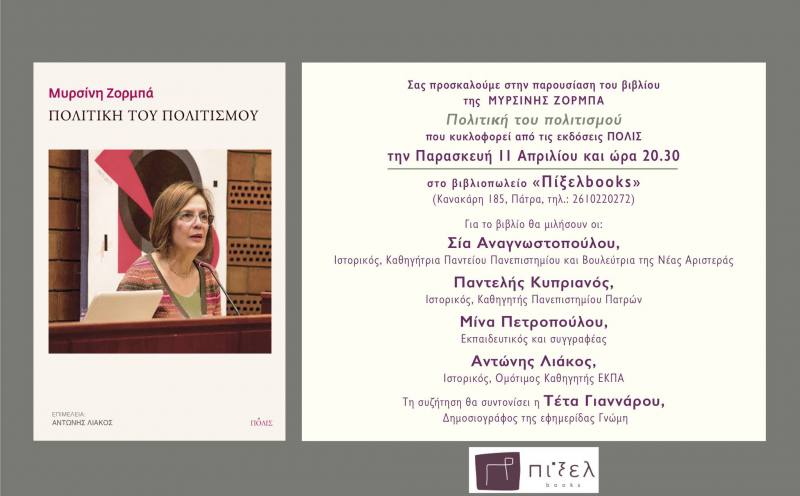 Σας προσκαλούμε στην παρουσίαση του βιβλίου της Μυρσίνης Ζορμπά «Πολιτική του πολιτισμού»