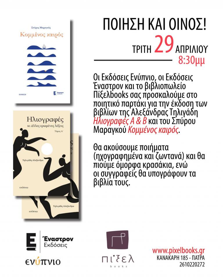 Οι Εκδόσεις Ενύπνιο, οι Εκδόσεις Έναστρον και το βιβλιοπωλείο Πίξελbooks σας προσκαλούμε στο ποιητικό παρτάκι για την έκδοση των βιβλίων της Αλεξάνδρας Τηλιγάδη “Ηλιογραφές Α & Β” και του Σπύρου Μαραγκού “Κομμένος καιρός”.