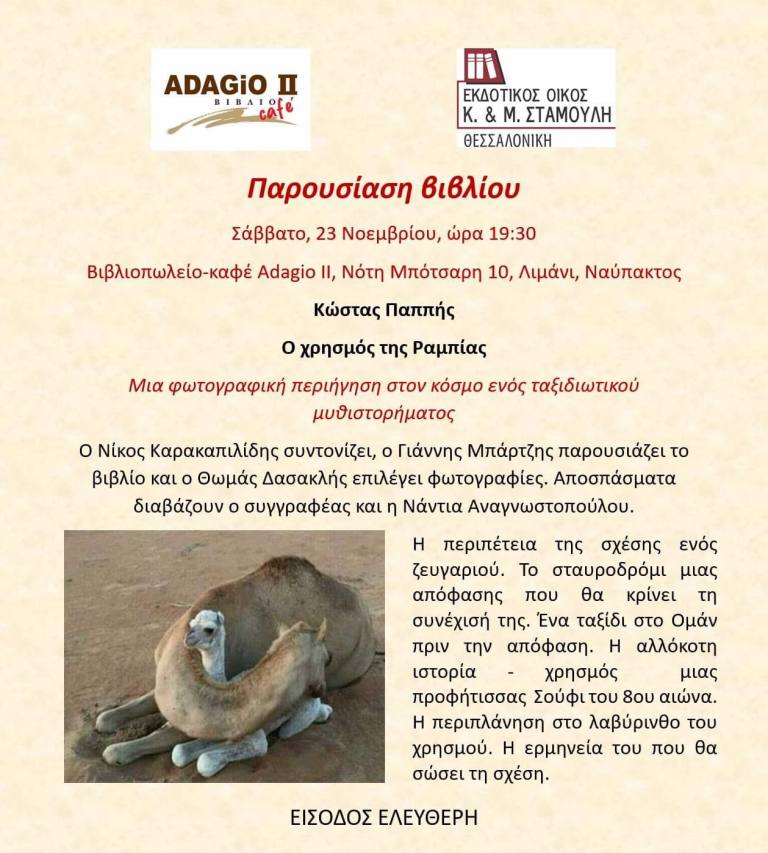 Το Adagio II σας προσκαλεί αυτό το Σάββατο 23/11 στις 19:30 στην παρουσίαση βιβλίου του Κώστα Παππή «Ο χρησμός της Ραμπίας». Ο Νίκος Καρακαπιλίδης συντονίζει, ο Γιάννης Μπάρτζης παρουσιάζει το βιβλίο και η Νάντια Αναγνωστοπούλου διαβάζει αποσπάσματα.