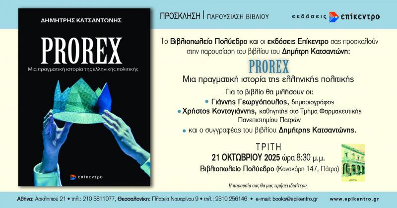 Παρουσιάζει την Τρίτη 21 Οκτωβρίου, στις 8:30 το βράδυ, στο Πολύεδρο, το βιβλίο του Κατσαντώνη Δημήτρη με τίτλο «PROREX. Μια πραγματική ιστορία της ελληνικής πολιτικής», που κυκλοφορεί από τις εκδόσεις Επίκεντρο.