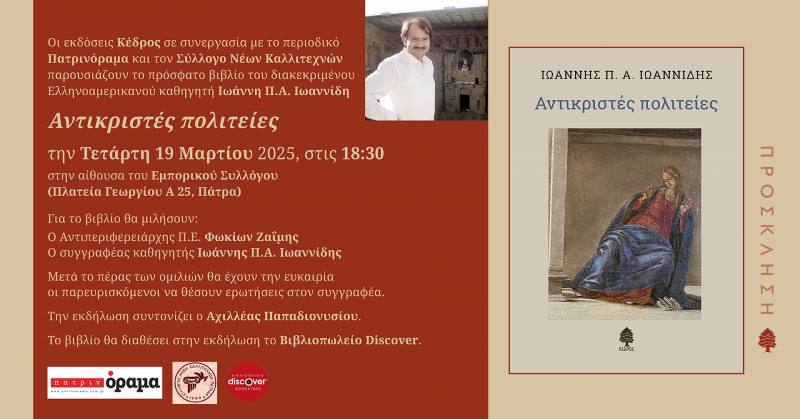 Οι εκδόσεις Κέδρος σε συνεργασία με το περιοδικό Πατρινόραμα και τον Σύλλογο Νέων Καλλιτεχνών παρουσιάζουν στην Πάτρα, την Τετάρτη 19 Μαρτίου και ώρα 18:30, στην αίθουσα του Εμπορικού Συλλόγου (Πλατεία Γεωργίου Α 25) το πρόσφατο βιβλίο του διακεκριμένου Ελληνοαμερικανού καθηγητή Ιωάννη Π.Α. Ιωαννίδη