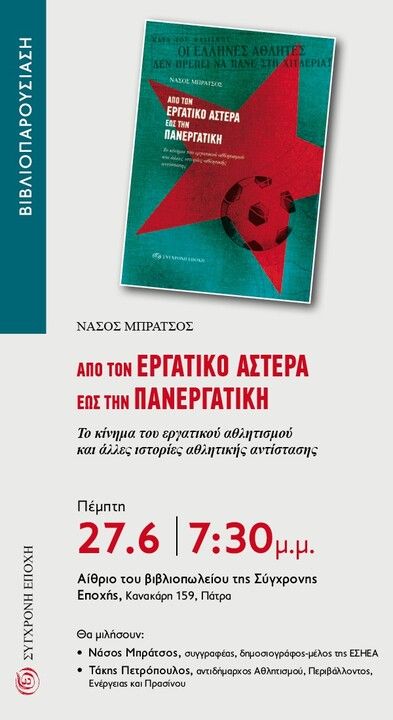 Η Σύγχρονη Εποχή παρουσιάζει τη νέα έκδοση «Από τον Εργατικό Αστέρα έως την Πανεργατική. Το κίνημα του εργατικού αθλητισμού και άλλες ιστορίες αθλητικής αντίστασης» του Νάσου Μπράτσου, την Πέμπτη 27 Ιούνη στις 7.30 μ.μ..