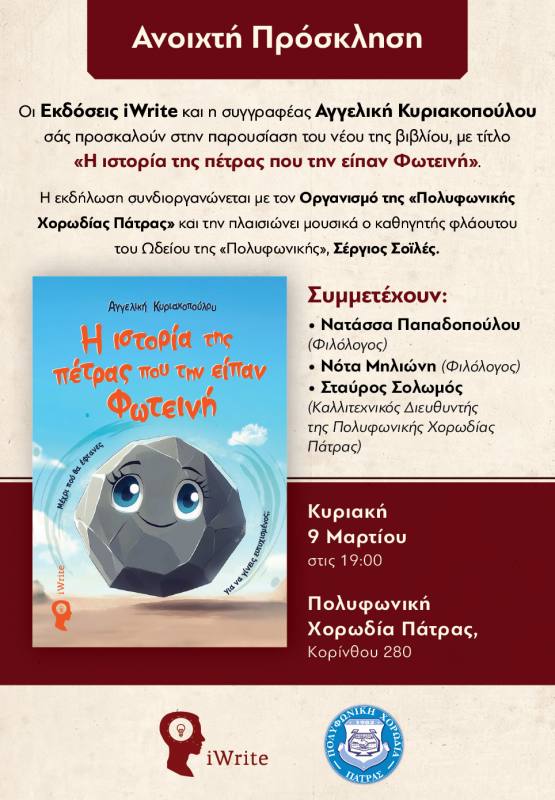 Η συγγραφέας- καθηγήτρια πιάνου του Ωδείου της ”ΠΟΛΥΦΩΝΙΚΗΣ”, φιλόλογος και ψυχολόγος, Αγγελική Κυριακοπούλου, παρουσιάζει το νέο της βιβλίο: ”Η ιστορία της πέτρας που την είπαν Φωτεινή” (εκδόσεις iWrite). Την Κυριακή 9 Μαρτίου, στις 7 το απόγευμα, στην αίθουσα ”Τόλης Νομικός” του Οργανισμού (Κορίνθου 280). Για το βιβλίο της θα μιλήσουν οι φιλόλογοι, Νατάσα Παπαδοπούλου και Νότα Μηλιώνη και ο Καλλιτεχνικός Διευθυντής της ”ΠΟΛΥΦΩΝΙΚΗΣ”, Μο Σταύρος Σολωμός. Την παρουσίαση θα πλαισιώσει μουσικά, ο καθηγητής φλάουτου του Ωδείου της ”ΠΟΛΥΦΩΝΙΚΗΣ” Σέργιος Σοϊλές. Είσοδος ελεύθερη.